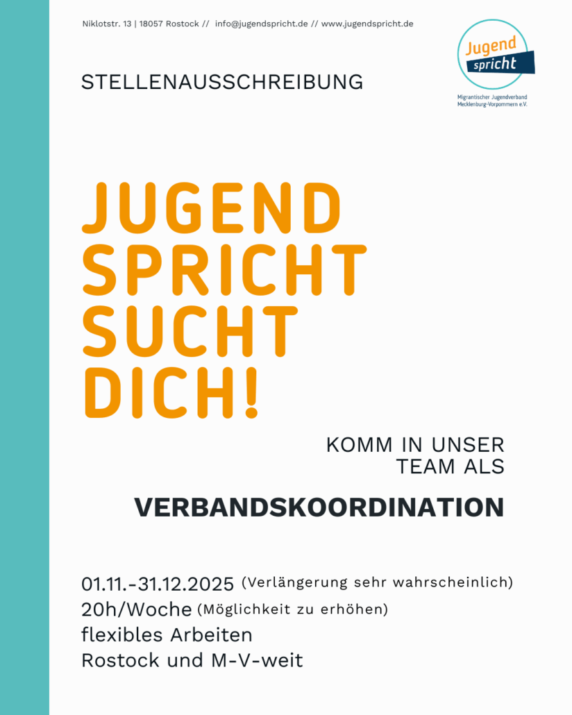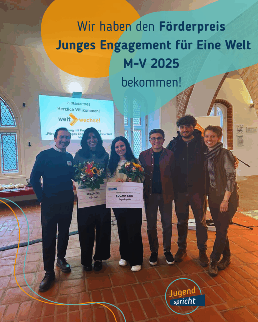 Jugend spricht ist eine Initiative junger Geflüchteter in Mecklenburg-Vorpommern, die sich seit 2019 für die Gleichberechtigung und gegen die Diskriminierung geflüchteter Menschen einsetzt. Wir tun dies, indem wir Kinder und Jugendliche zusammenbringen, unterstützen und Freizeitangebote schaffen. Jugend spricht bietet politische Bildung (Workshops und Seminare, u.a. zum Thema Asyl- und Arbeitsrecht), interkulturelles Lernen, Ausflüge und Begleitung bei der Orientierung in Deutschland. Eindrücke über unsere Aktivitäten finden Sie auf Instagram @jugend.spricht19.